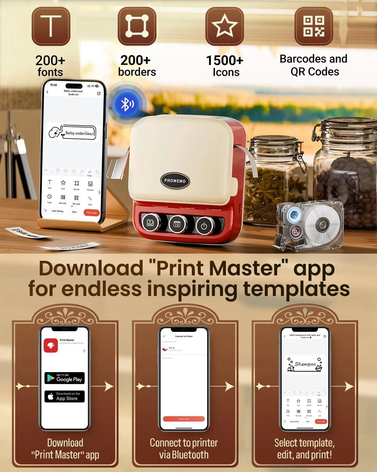 We designed the experience to be completely seamless. Just connect via Bluetooth to our intuitive smartphone app, available on iOS and Android. With over 200 fonts and 600 symbols at your fingertips, designing your custom ribbons is as simple and quick as sending a text message.